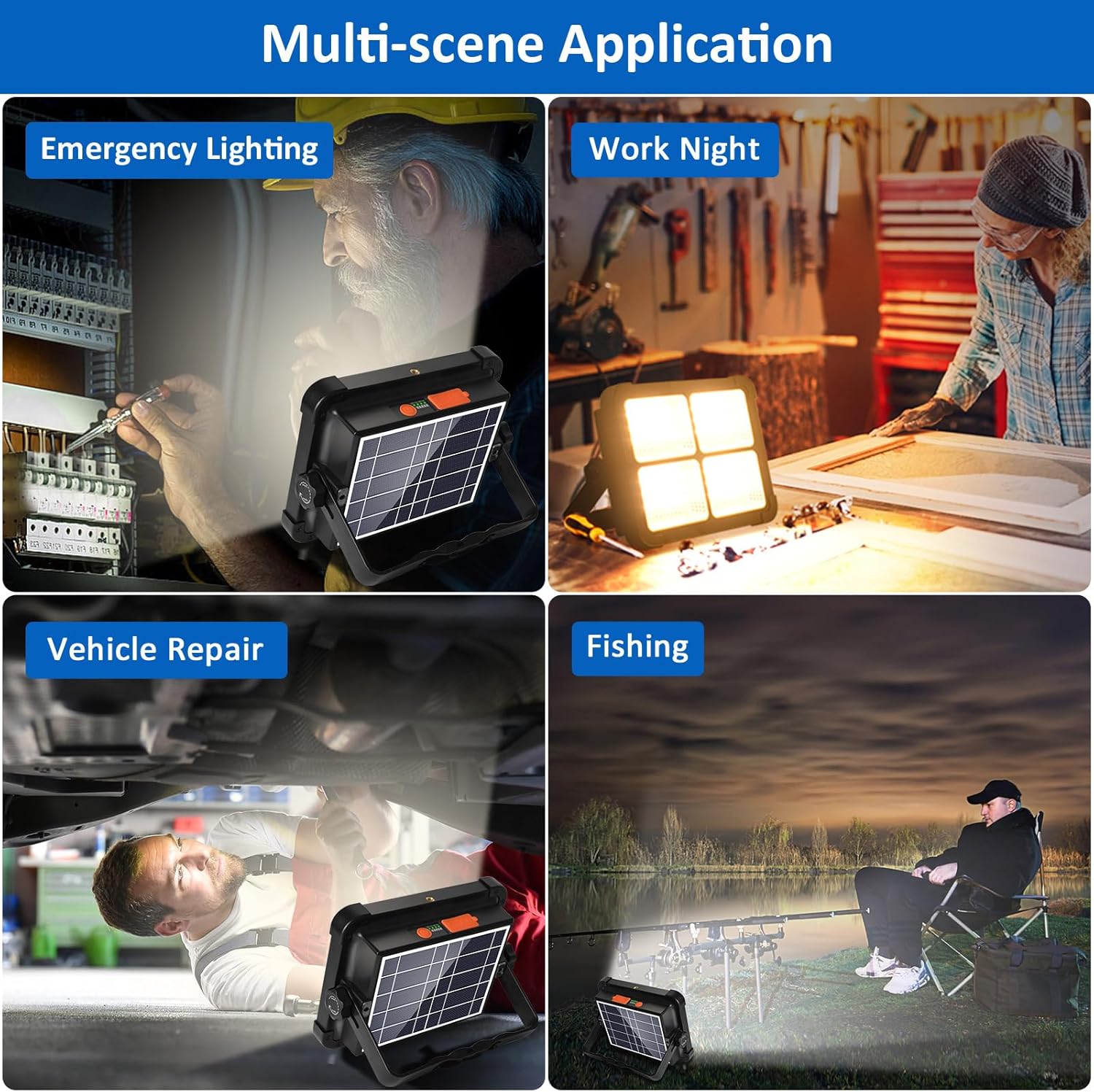 - 👍【RECHARGEABLE LED WORK LIGHT】Led work solar light is equipped with rechargeable battery and solar back panel. The portable work light has a solar panel that allows it to charge during the day and a USB input that can be charged with current, which is very energy efficient.